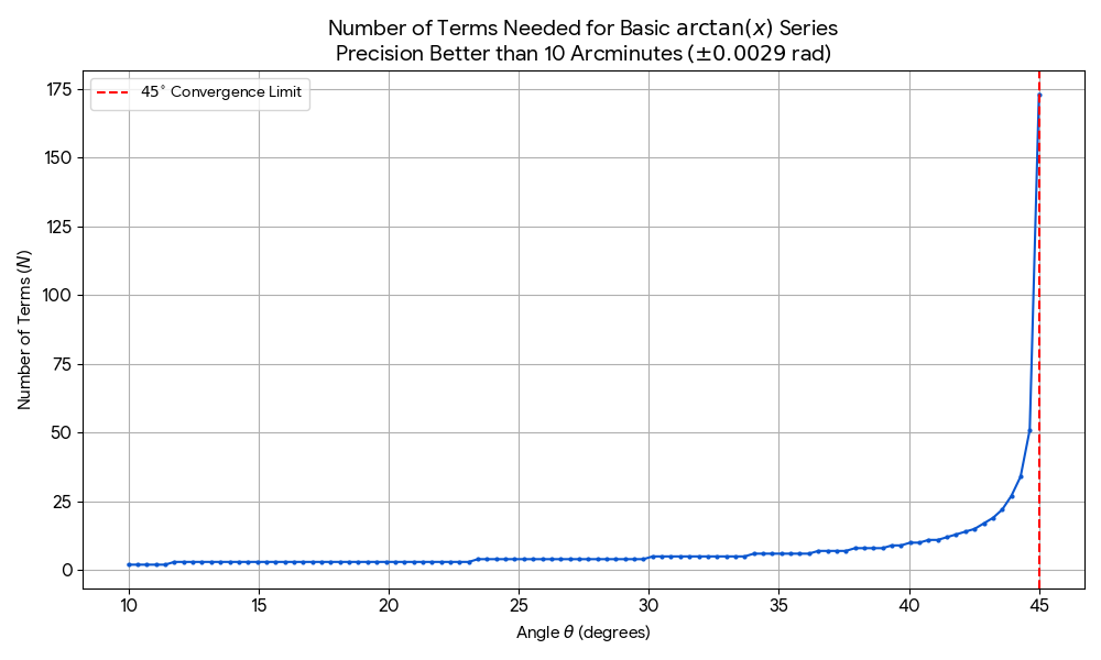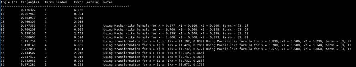 Pro malé úhly (do cca 30 stupňů) je počet členů, které je třeba sečíst pro dosažení požadované přesnosti, celkem malý (3-5 členů). Pak začíná prudce narůstat a pro 45 stupňů se limitně blíží nekonečnu. Pro úhly nad 45 stupňů řada diverguje, protože x je větší než jedna.